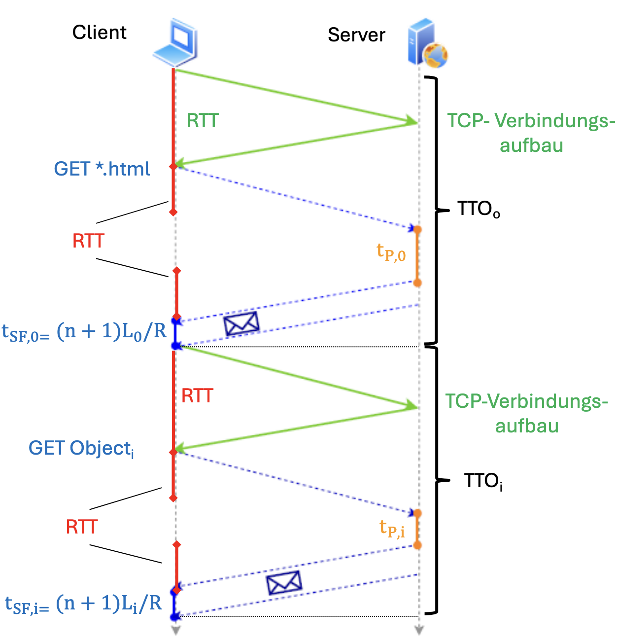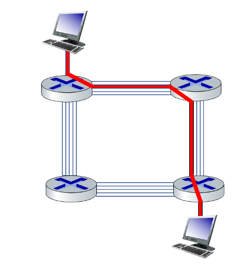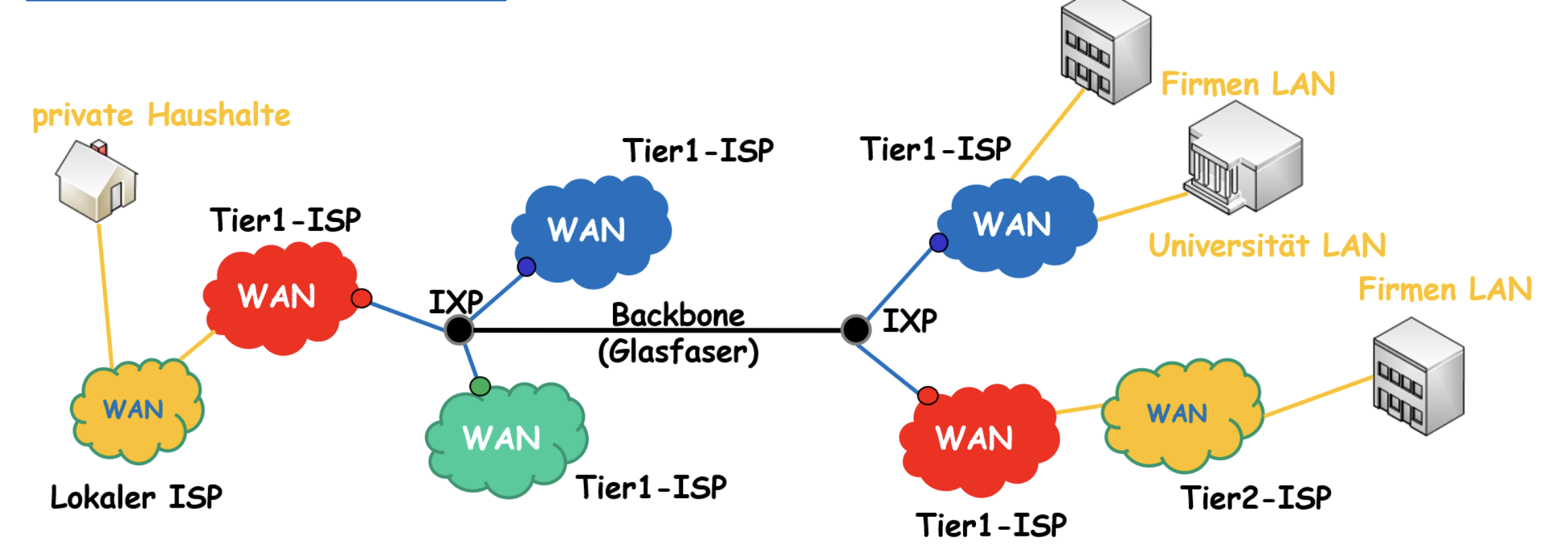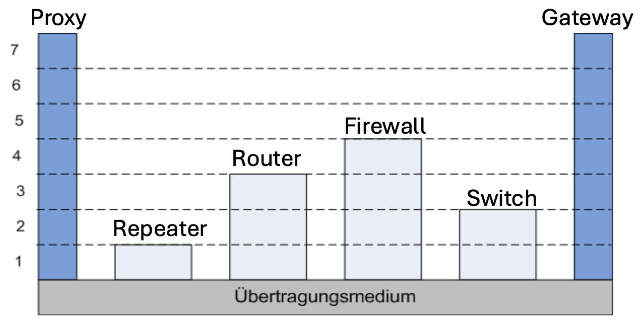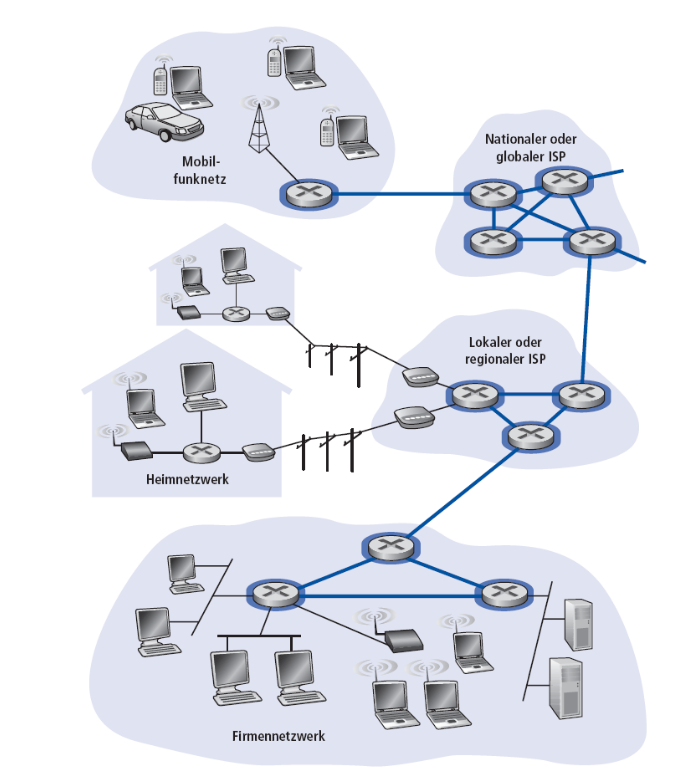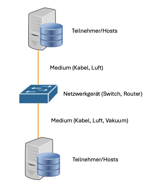 Ein Endsystem in solch einem Netzwerk besteht aus der Hardware selbst (Laptop, PC, etc.), einer oder mehreren Anwendungen (Browser, Web Server, etc.) und einer Übertragungsschnittstelle, dem sogenannten MODEM (von Modulator: digital → analog und Demodulator: analog → digital). Der Übertragungskanal besteht aus einem Übertragungsmedium (Kabel, Luft, etc.) und Vermittlungseinrichtungen (Router, Switches, Multiplexer, Repeater), die auch als Netzwerkgeräte bezeichnet werden.