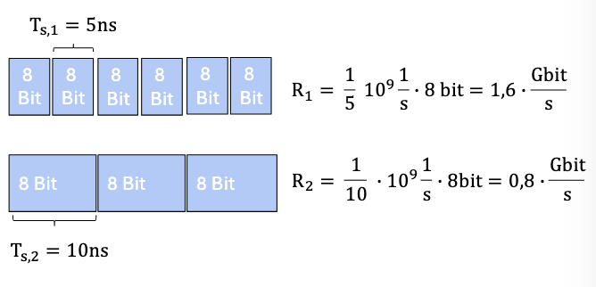 Die zeitliche Länge eines Symbols bestimmt die Anzahl der Bits, die pro Zeiteinheit übertragen werden können. Die Übertragungsrate eines Kanals ist dann gegeben durch die Symbolrate , also die Anzahl der Symbole pro Sekunde mal der Anzahl an Bits , die pro Symbol transportiert werden können: