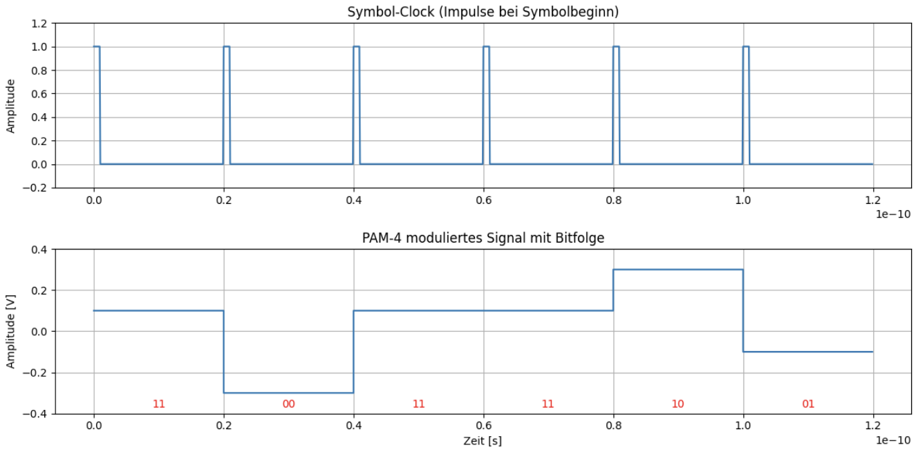 Bei PAM werden die binären Nachrichtensignale direkt in Form von Spannungsimpulsen auf eine Kupferleitung moduliert. Das Clock-Signal ist Zeitgeber für die Leitungsmodulation des Nachrichtensignals. Die Clock-Frequenz entspricht der Symbolrate .