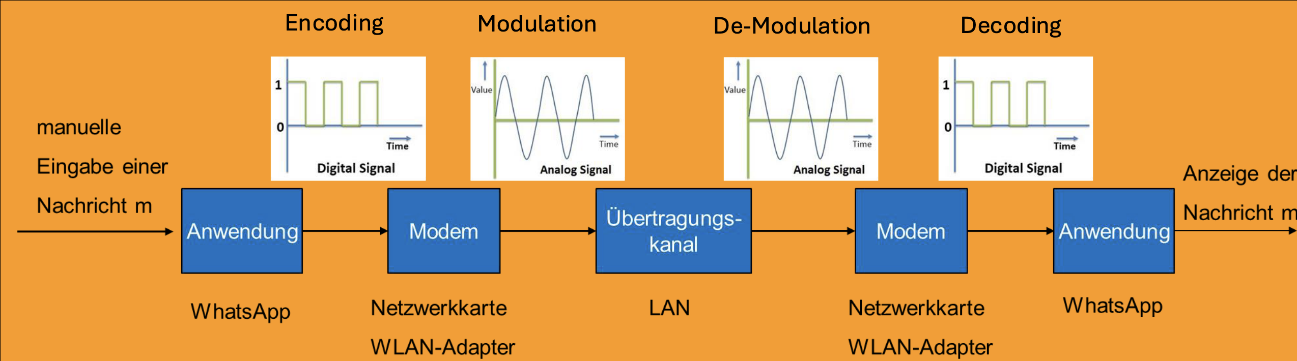 Im Falle eines Netzwerkes wird eine digitale Nachricht als analoges Signal übertragen.