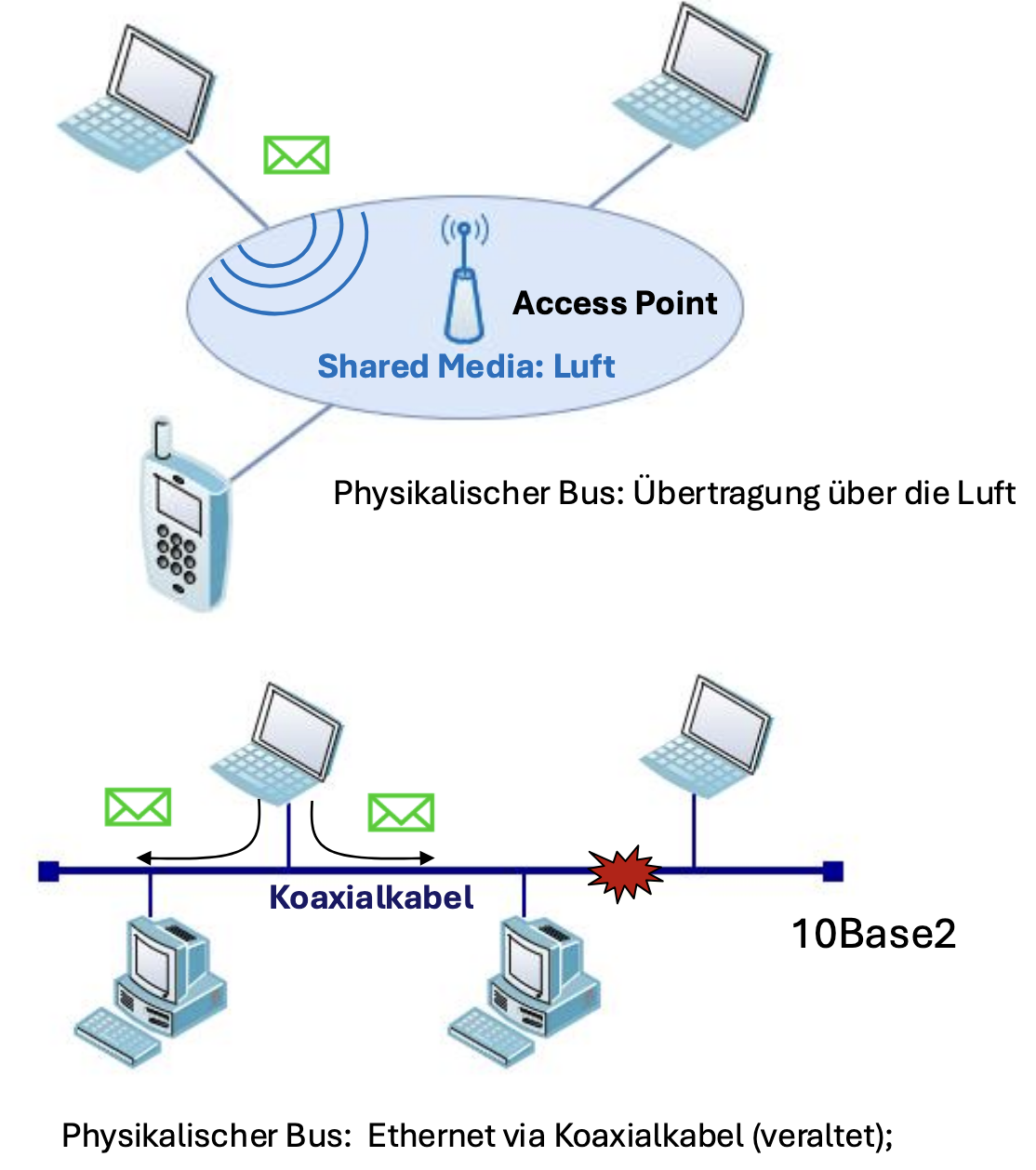 - Beispiele: Ethernet HUB, Koaxialkabel, WLAN