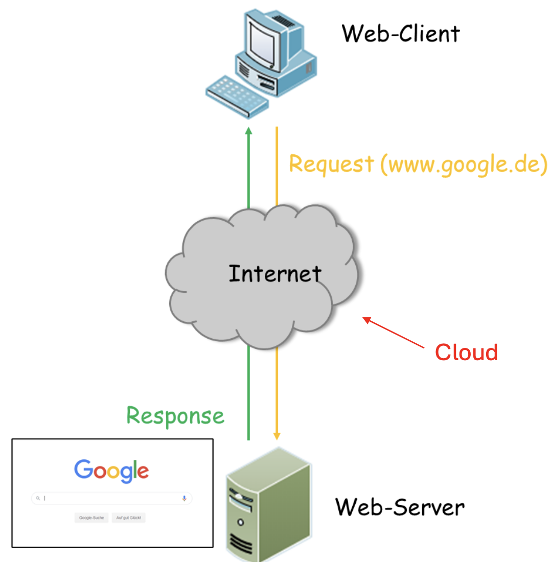 Hier stellt ein Server dauerhaft zentral im Internet Dienste (Funktionen, APIs, Daten) zur Verfügung, die ein Client bei Bedarf anfragen kann. Sicherheit und Management der Ressourcen erfolgt zentral beim Server.