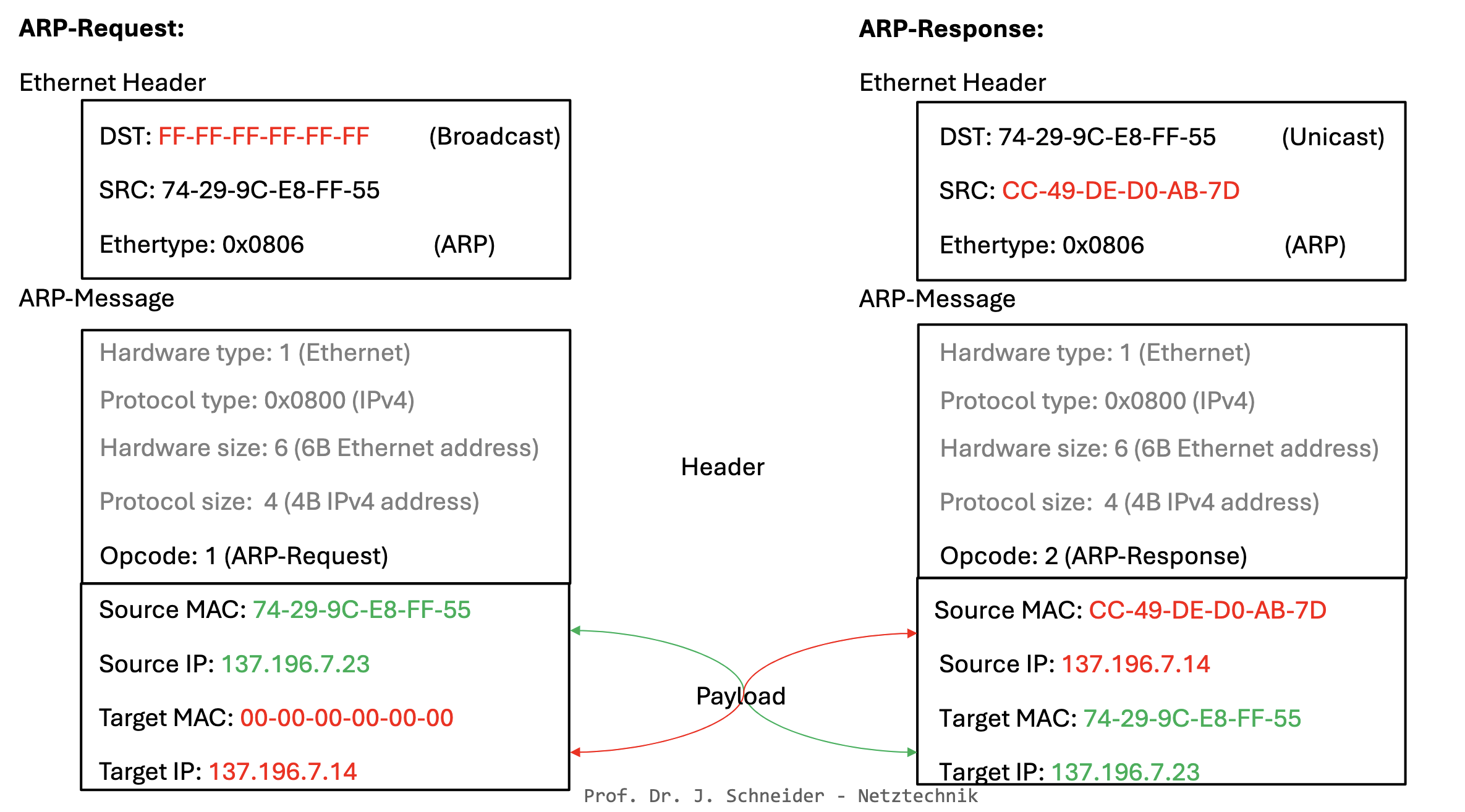 - Intransparenter Modus: Router ersetzt Source-MAC-Adresse durch MAC-Adresse seines Out-Ports und die Ziel-MAC-Adresse des Empfängers im neuen Subnet