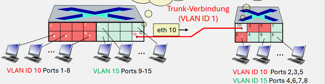 - VLAN Trunking: auf jeden Switch wird ein spezieller Port als Trunk-Port definiert