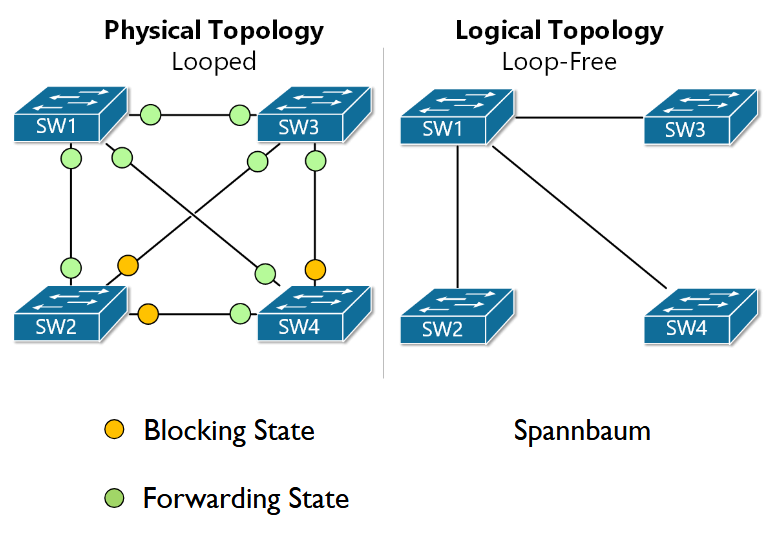 - Mit STP können Switches ihre Ports als “Forwarding” oder “Blocking” markieren.