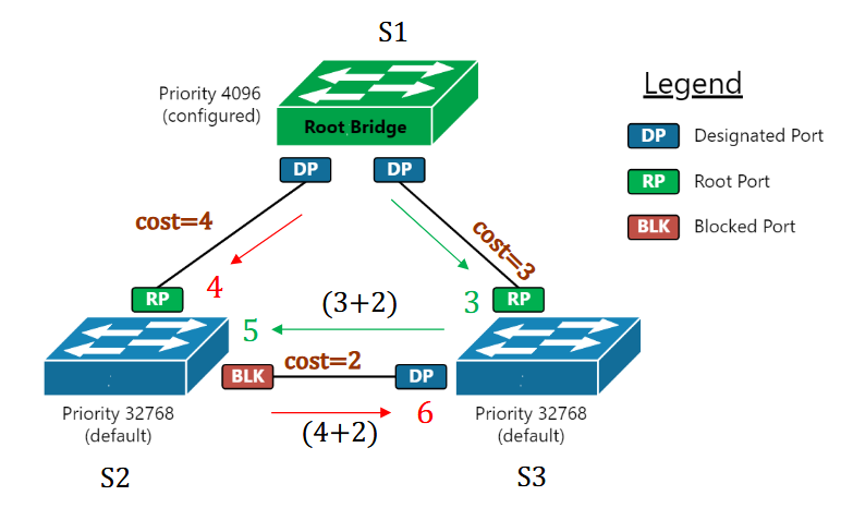 - Root-Port Berechnung: Für die restlichen Switches bestimmt der Algorithmus den Port mit den geringsten Pfadkosten zum Root-Switch. Dieser Port wird als Root-Port (RP) bezeichnet und ebenfalls in FWD-State gesetzt