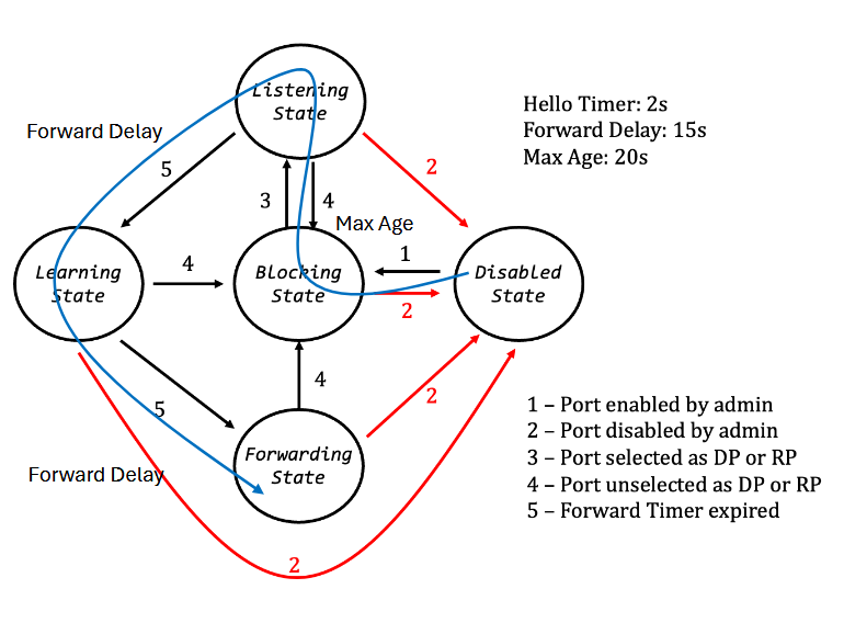 - Blocking State: Ein Port in diesem Zustand lernt keine Ethernet-Frames und MAC-Adressen, verarbeitet aber Frames des Protokolls, um im Falle eines Fehlers den Zustand wechseln zu können.