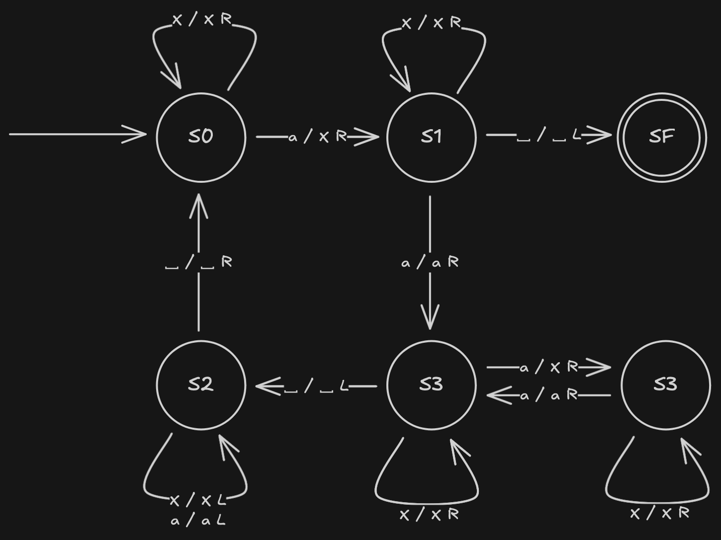 Turing-Maschinen können Nichtdeterministisch sein. Wie bei einem NEA können fĂŒr jeden Zustand und fĂŒr jedes Bandsymbol mehrere Ăbergange existieren. Die NTM wĂ€hlt immer den geeigneten Ăbergang aus (Hellsehen / Backtracking.)